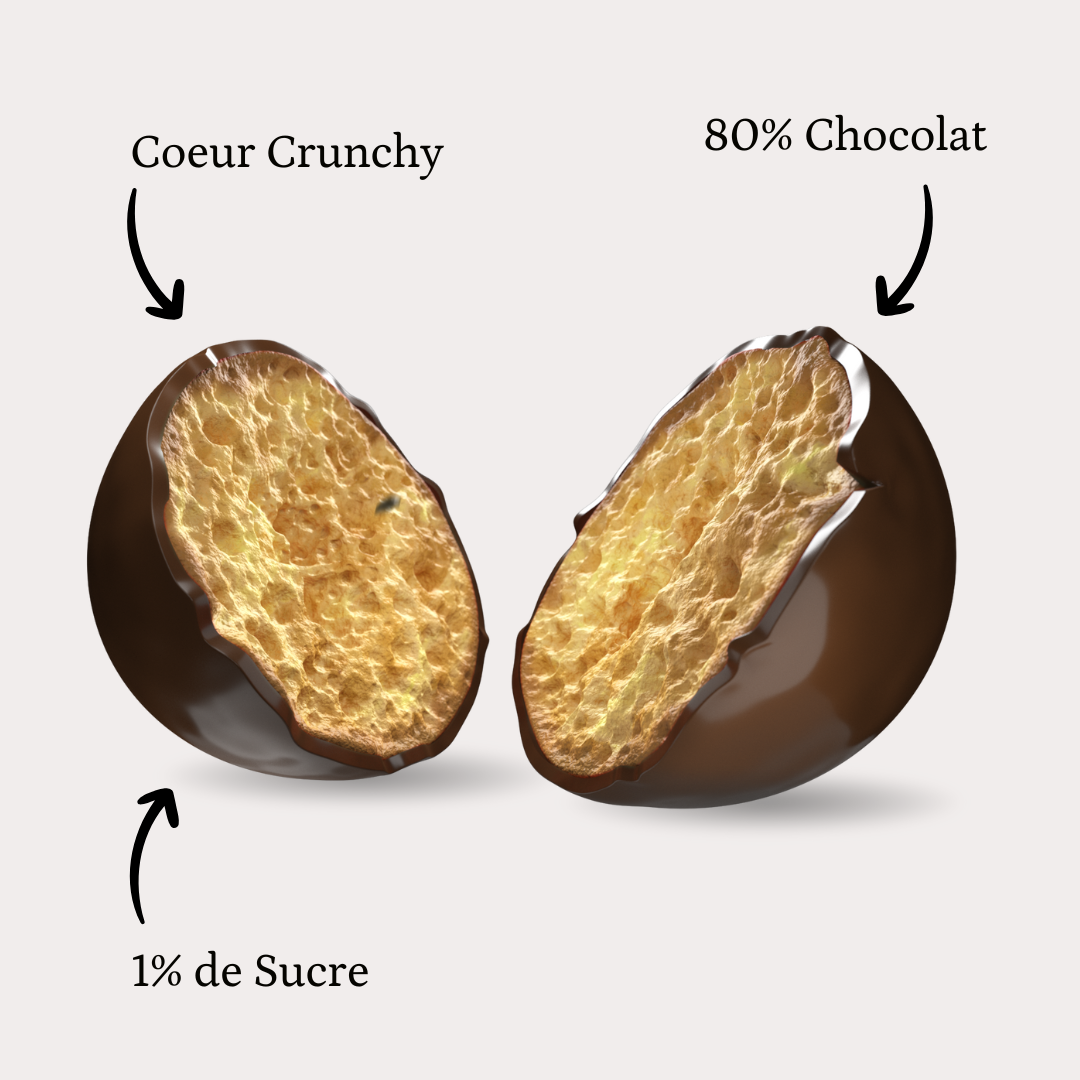 Une texture crunchy, un chocolat fondant et juste ce qu’il faut de sucre. Rien de plus.