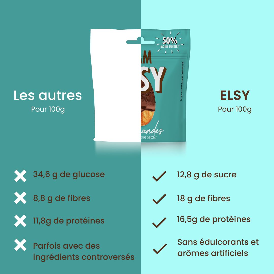 Il y a mille raisons de choisir Elsy : Moins 90% de sucre, plus de fibres, et le même plaisir au quotidien.