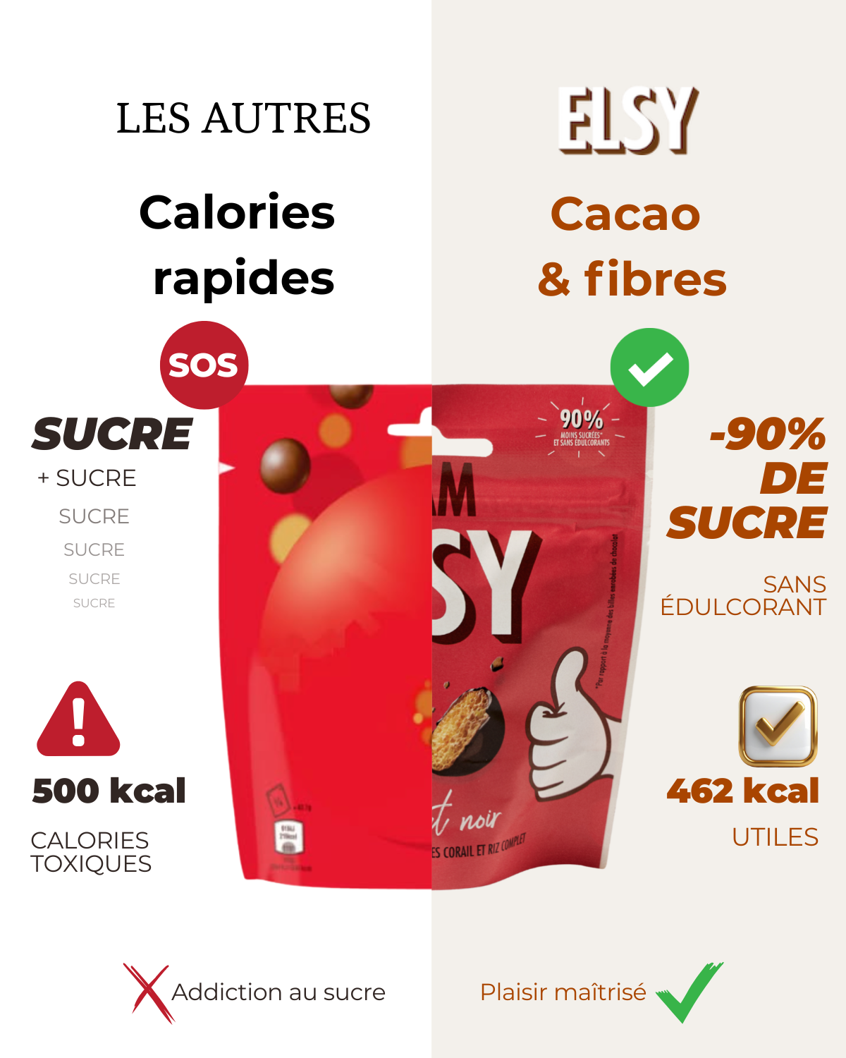 Résultat : même zone calorique, mais ELSY cale mieux — donc on en mange moins souvent et en plus petite quantité.